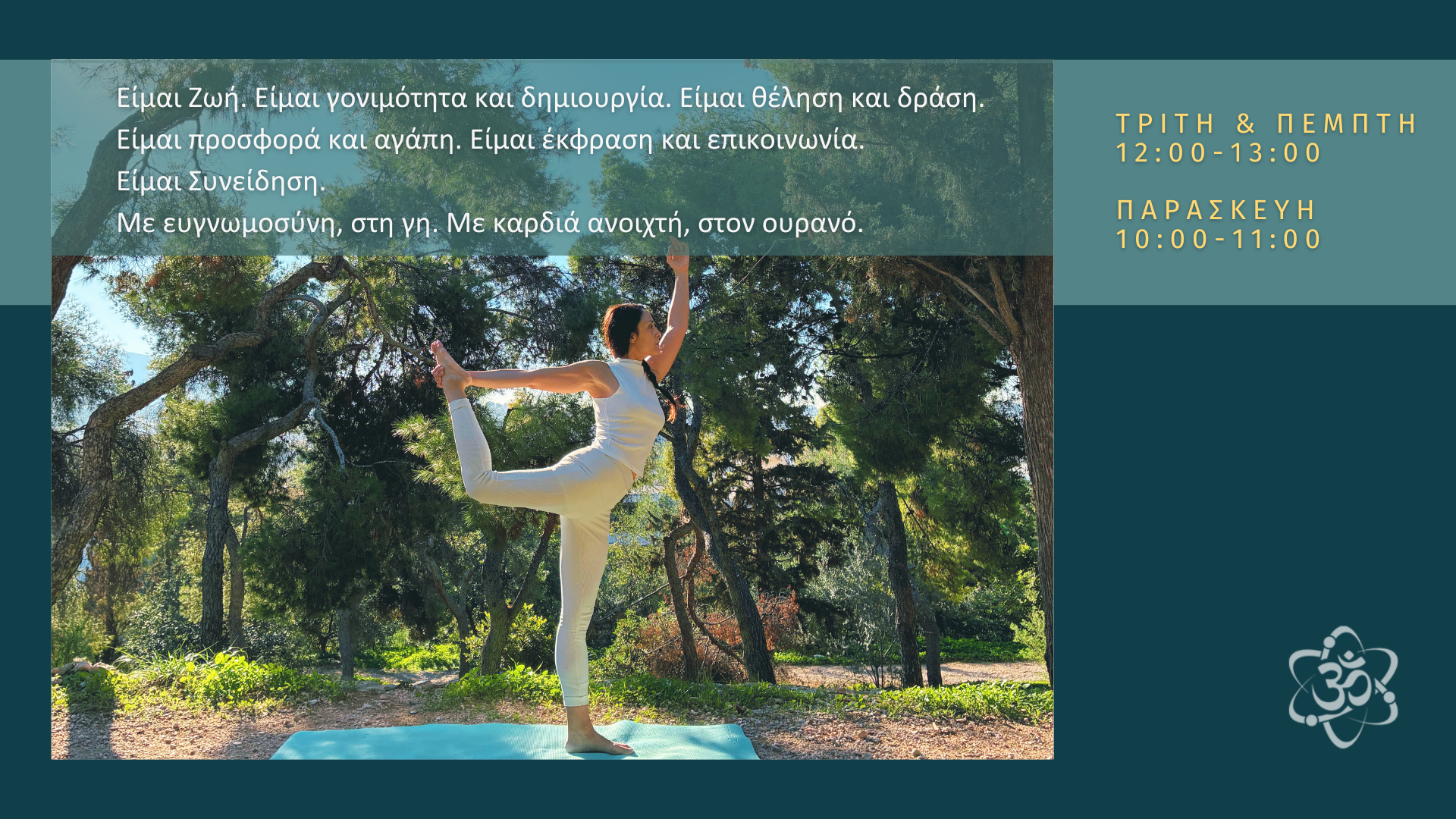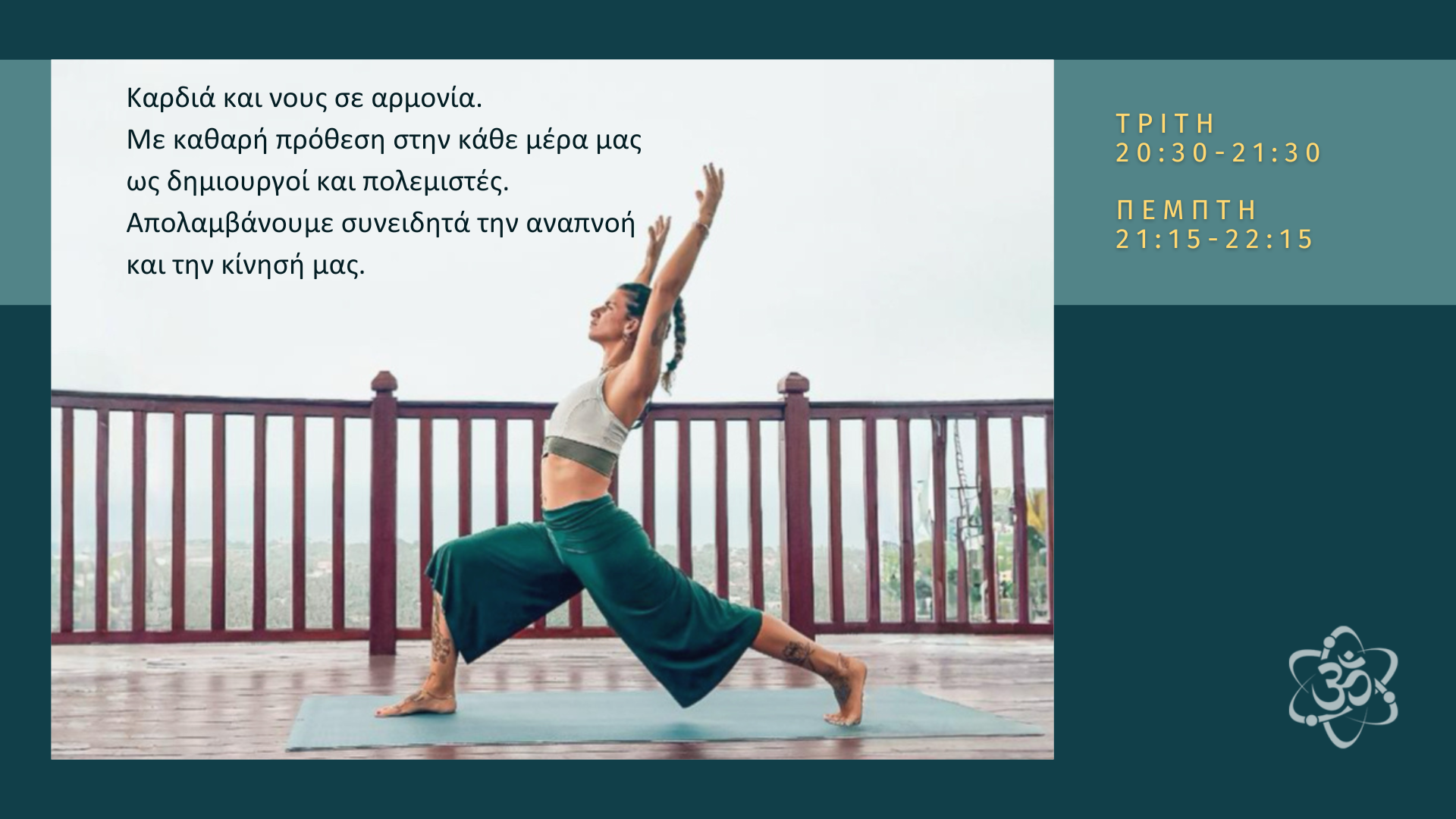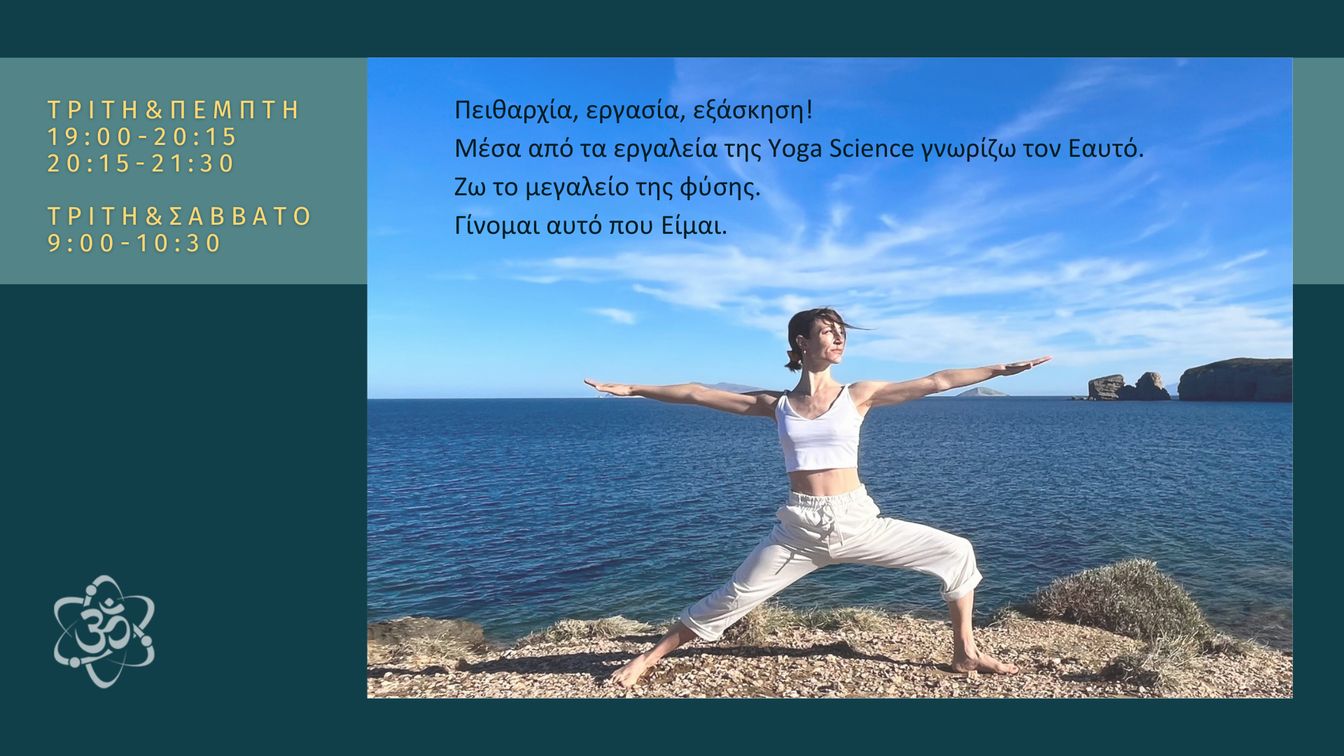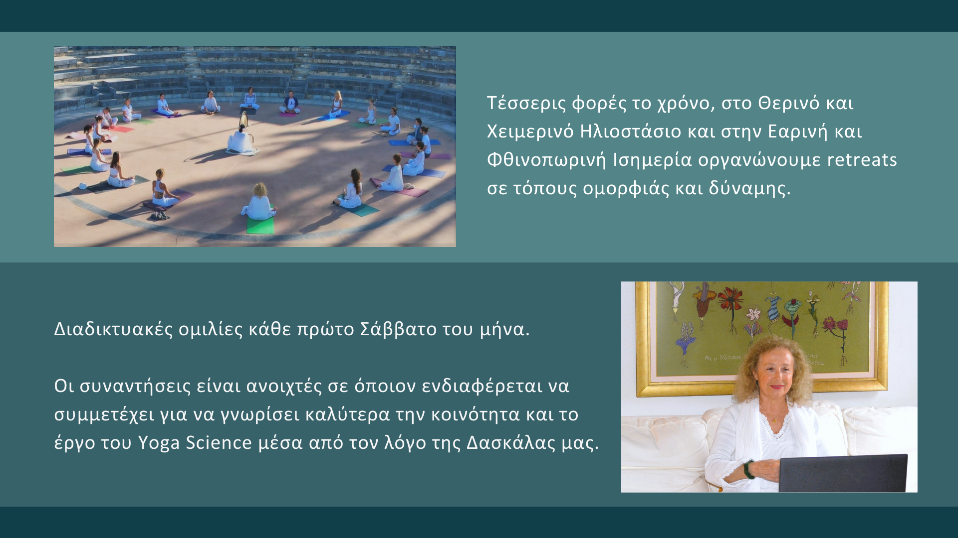 Ατομικές Συναντήσεις με τη Νάγια Καρνάβα Πληροφορίες στο email: info@yogascience.gr Porto, Portugal - Μαθήματα Yoga Science μέσω ZOOM με την Ειρήνη Άψυχου Πληροφορίες στο email: eirini_ap@hotmail.com Θεσσαλονίκη - Μαθήματα Yoga Science στο κέντρο, περιοχή Βαλαωρίτου με τη Λίλα Νικολάου Πληροφορίες στο email: nikolaoufilomila@gmail.com Νάξος, Κυκλάδες - Μαθήματα Yoga Science στη Χώρα της Νάξουμε την Άλκηστη Παναγιωτοπούλου Πληροφορίες στο email: alkistip@hotmail.com Poland - Yoga Science classes in English, private & small groups via ZOOM with Freiderike Papastavropoulou For more information contact via email: freiderike.artist@gmail.com Αθήνα - Mαθήματα Yoga Science στο Wuji Center, Εξάρχεια με τη Μάρσυ Συρεγγέλα Πληροφορίες στο email: marsy.syre@hotmail.com Αθήνα - Mαθήματα Yoga Science στο Κουκάκι και στον Κεραμεικό με την Όλγα Σπυράκη Πληροφορίες στο email: olga_spy@yahoo.gr Αθήνα - Mαθήματα Yoga Science στην περιοχή Ψυρρή με την Αθανασία Πριοβόλου Πληροφορίες στο email: athpriov@yahoo.gr Αθήνα - Mαθήματα Yoga Science στα Πετράλωνα με τον Δημήτρη Λιούρδη Πληροφορίες στο email: dimitsos9@hotmail.com Πήλιο - Mαθήματα Yoga Science με την Μαρίνα Γιωτάκη Πληροφορίες στο email: marina_giotaki@yahoo.de Πήλιο - Διαλογιστικός περίπατος στη φύση με τον Wolfgang Knorr Πληροφορίες στο email: wolfgang.knorr@web.de